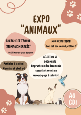Exposition de documents sur les animaux au CDI ! Activités connexes : "Cherche et trouve... 10 infos sur les animaux menacés", aide à la décoration, atelier d'origami...