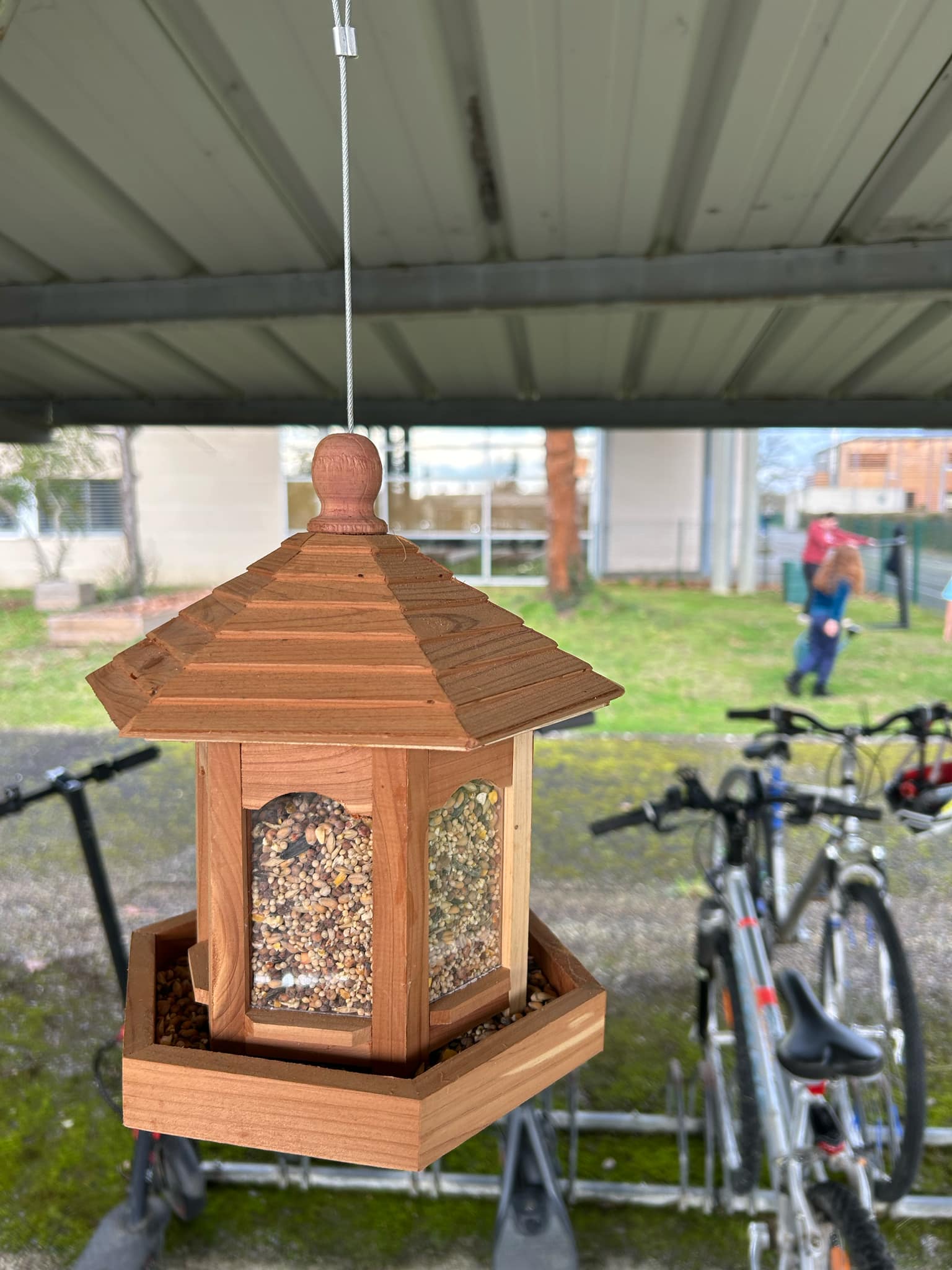 Aujourd'hui les élèves de l'atelier jardin ont mis en place un nichoir à mésanges ainsi que différents mangeoires pour les oiseaux.