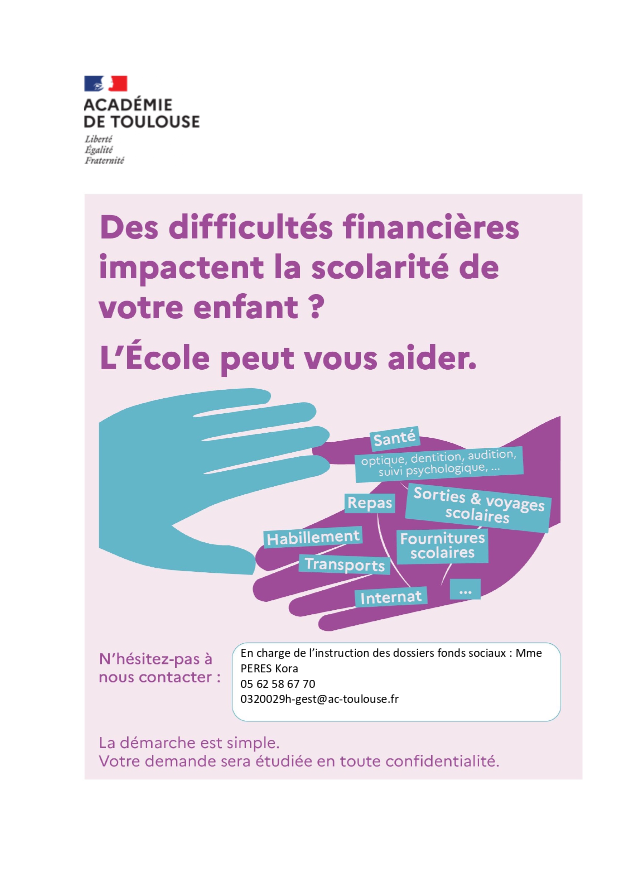 Des aides peuvent être accordées aux familles pour le paiement des factures de demi-pension, pour l'achat de matériel scolaire ou pour le financement de voyages scolaires. Pour cela il faut en faire la demande auprès du service intendance du collège, auprès de Mme Peres ou de Mme Jestin au 05 62 58 67 70.